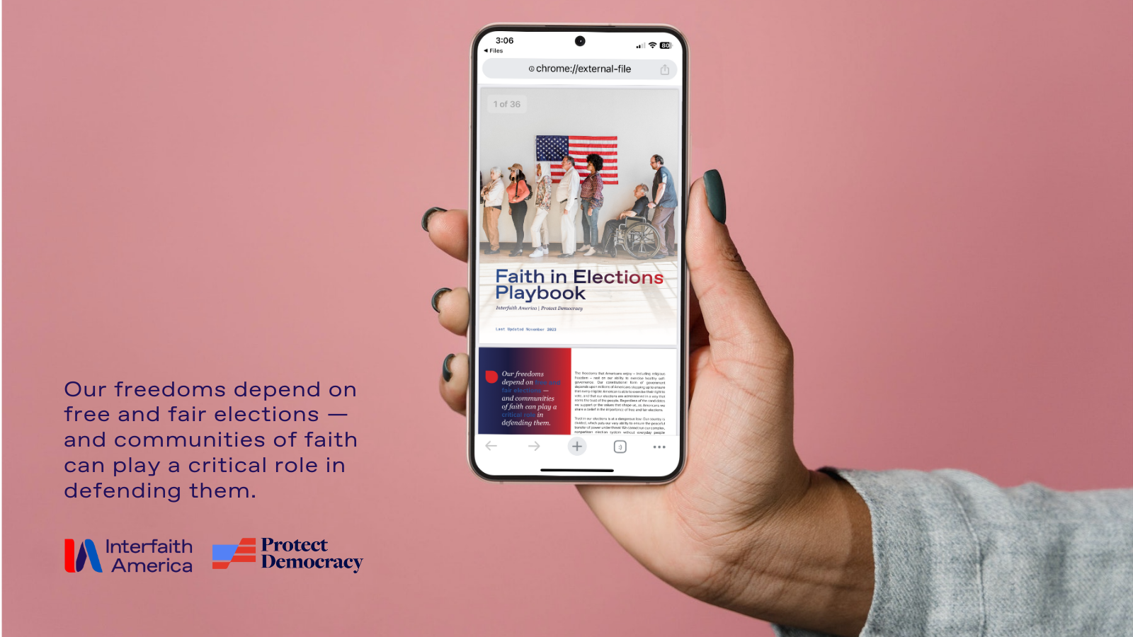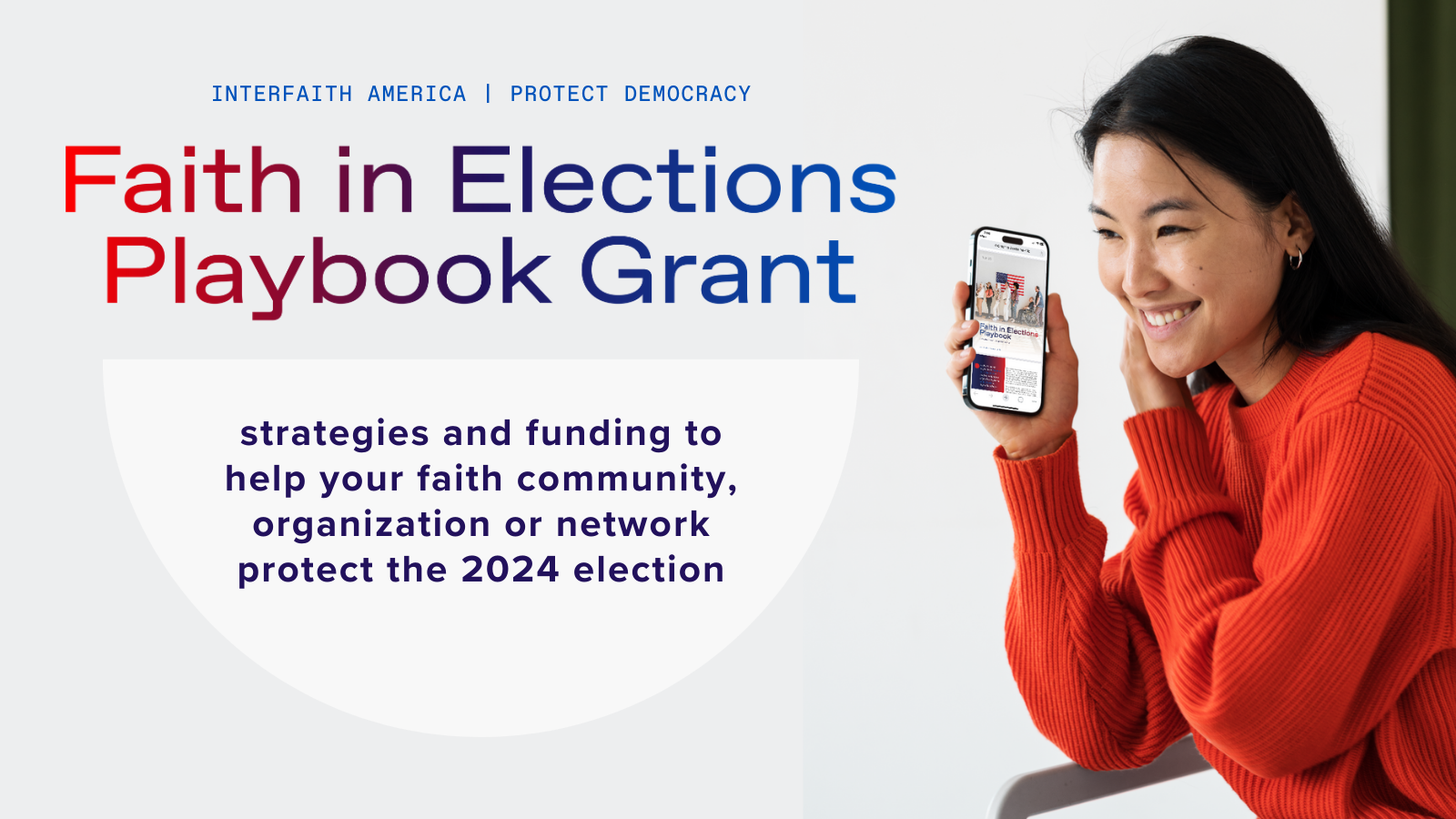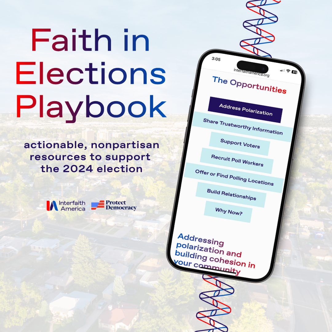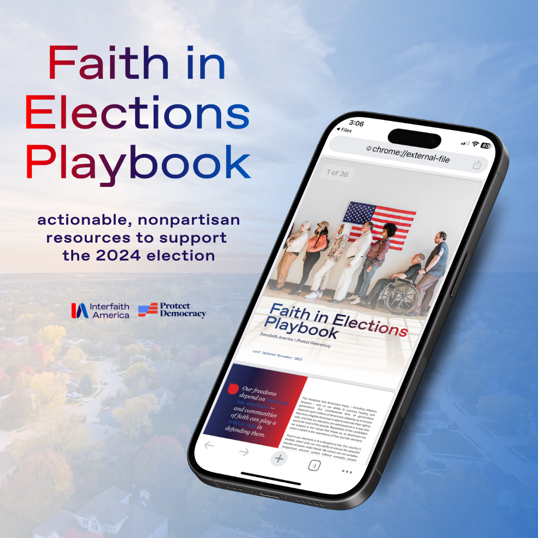 The Faith in Elections Playbook supports faith-based, civic and campus communities with accessible, actionable resources to support the 2024 election. This playbook is designed to make it easier for faith and community leaders to join work that is already happening across America to help the 2024 elections run smoothly, so that all eligible voters can access a ballot and every valid vote is counted.
